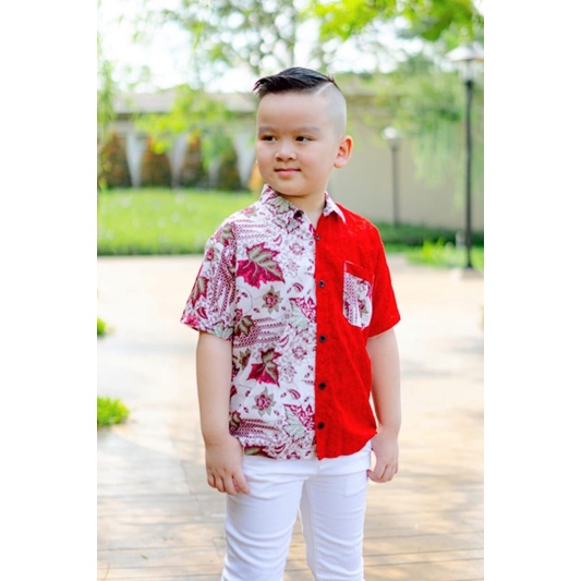 Banting Harga Pakaian di Kabupaten Belitung Kemeja Batik H Putih Merah Kombinasi Dan Full Batik Bahan Katun Adem Dan Halus Nyaman Pakai Sekolah dari Grosir Batik Anak Kota Pekalongan