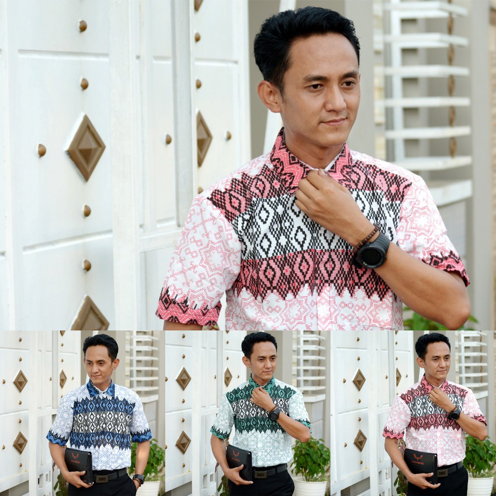 trolistore kemeja batik pria cowok motif ketigo merah biru hijau seragam batik murah pekalongan stok tersedia sesuai di shopee